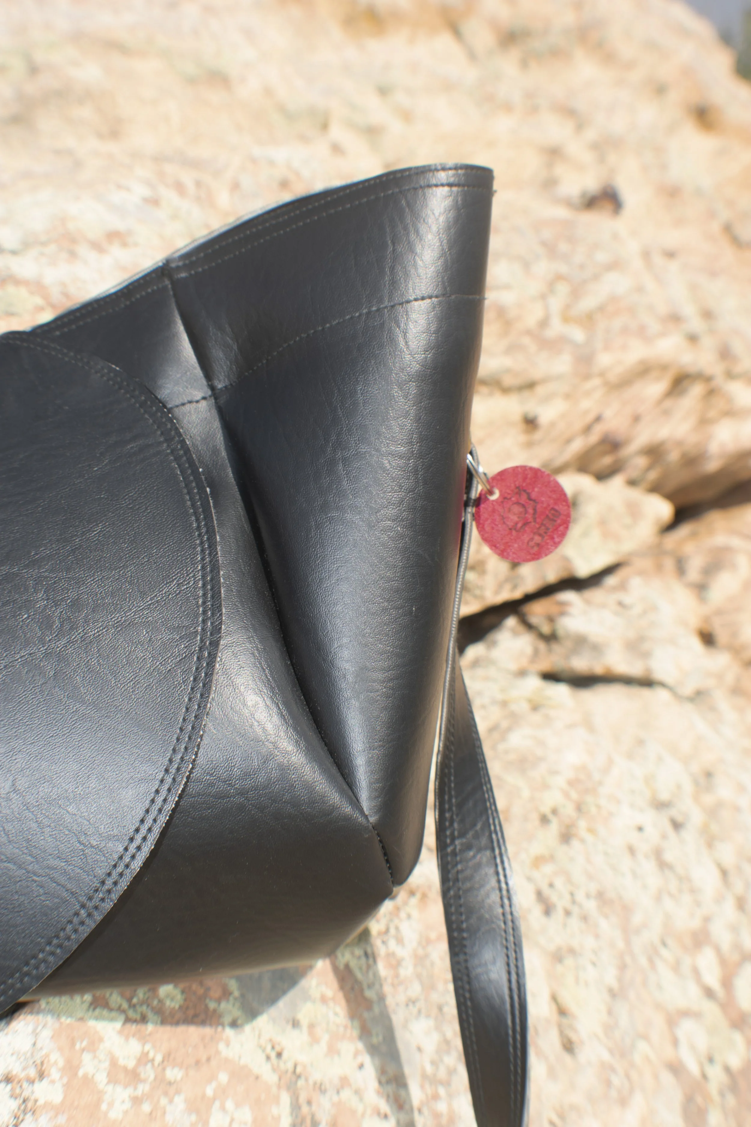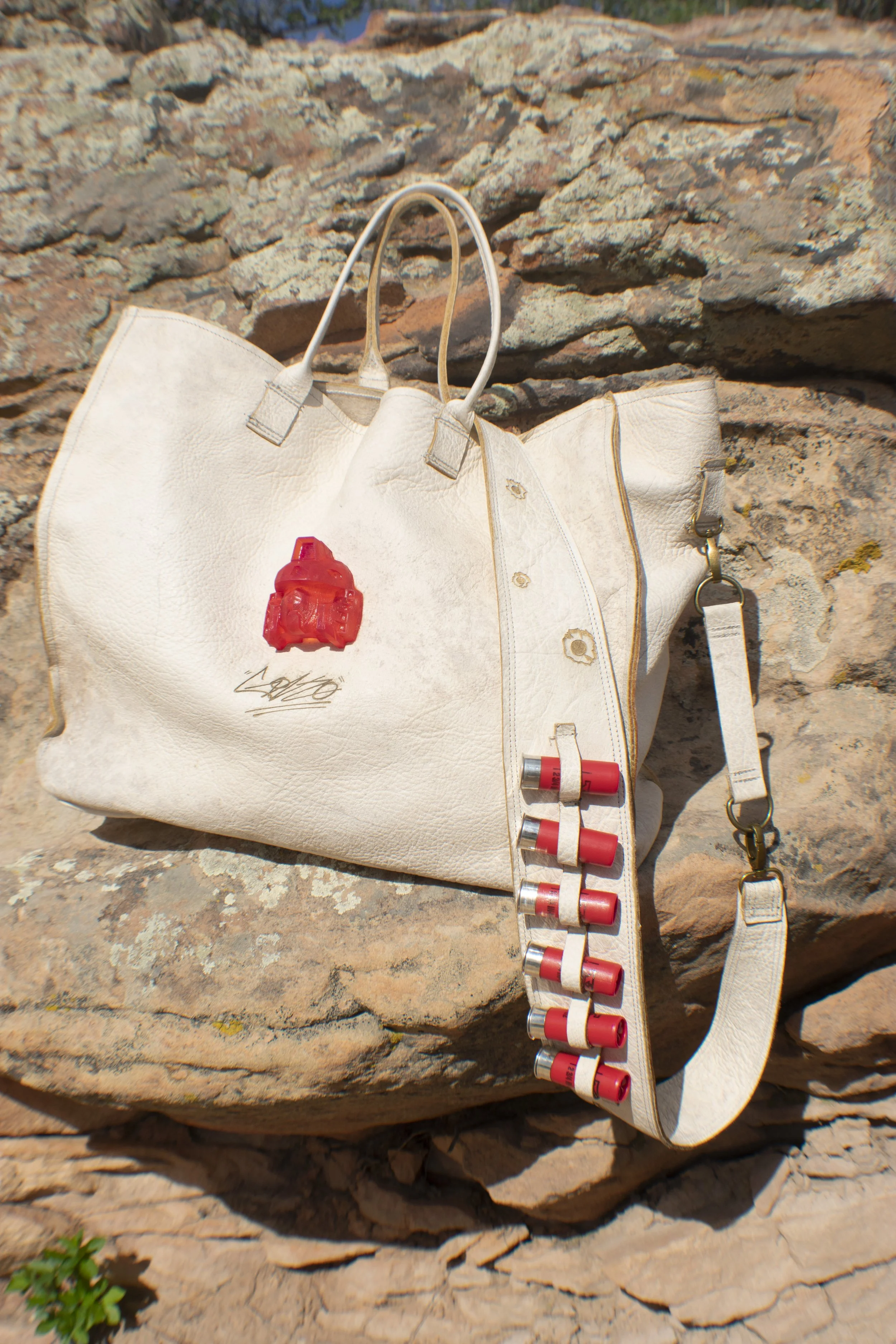 This bag is hand cut and crafted using faux leather and tie dyed sherpa as the liner for juxtaposition. The strap naturally widens at the shoulder for additional comfort. Also featured is a hand painted logo atop the magnetic flap closure, and to further toughen the aesthetic is a bullet keychain.