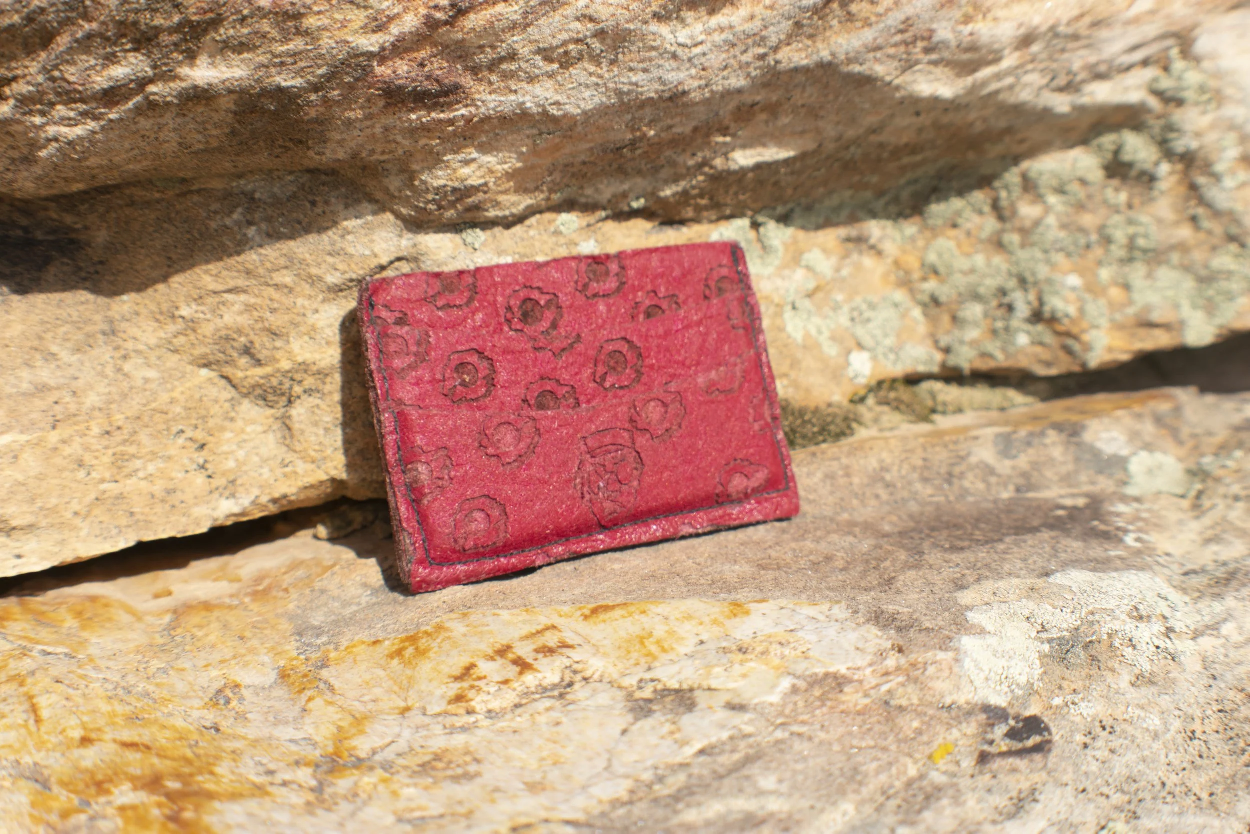 This is a wallet that has been laser cut and engraved with a custom bullet hole pattern. The leather featured is “Mulberry Red” Piñatex, or Pineapple Leather. This leather is made from the husks of pineapples and is extremely durable and made for excellent card holder material. Lastly is the original logo that has been etched into the lowest most card holder.
