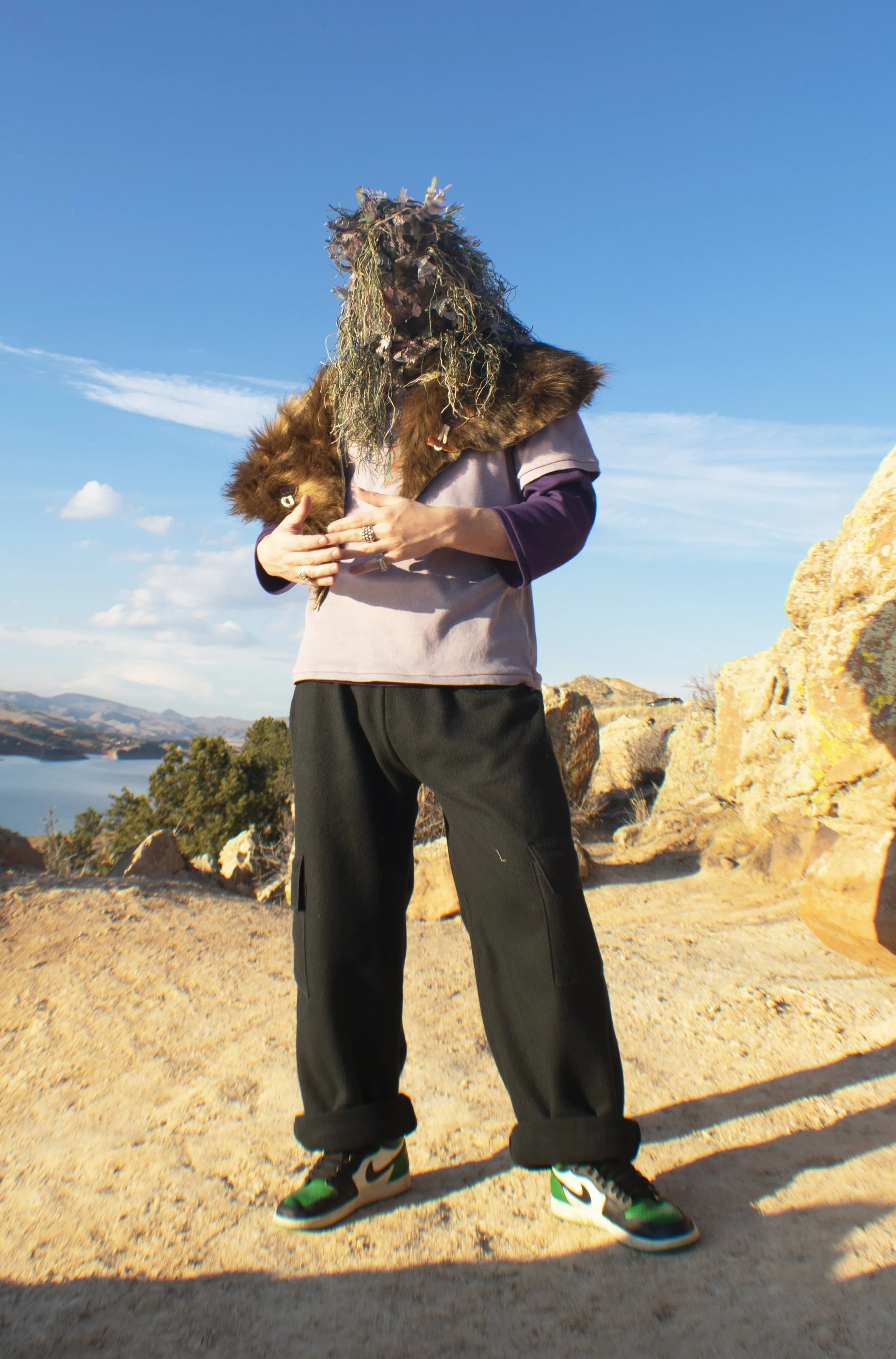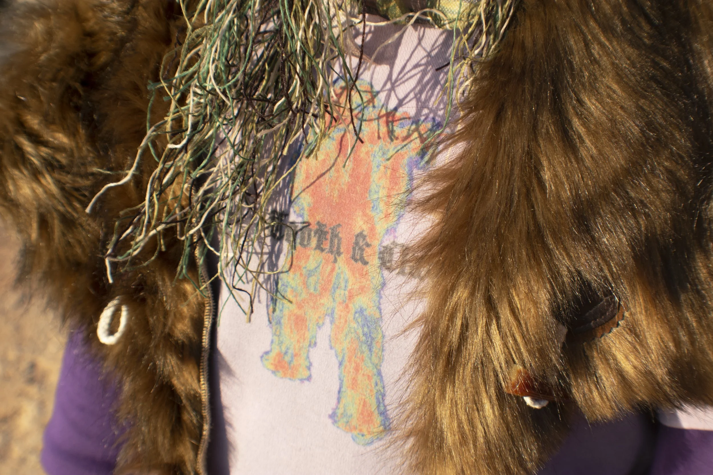 The fifth and final look in my collection features a handmade see through ghillie mask to really obscure the silhouette and identity of the wearer. The fur shawl layered on the shoulders features toggle closures, and the hand crafted and dyed single stitch tee shirt features an original graphic that has been heat transferred on. I chose a three quarter length sleeve for the shirt layered under the tee to play with silhouette even further. Finally, for the bottoms are a pair of baggy black fleece cargo pants, with faux leather branding to keep things simple while still keeping an exaggerated look.