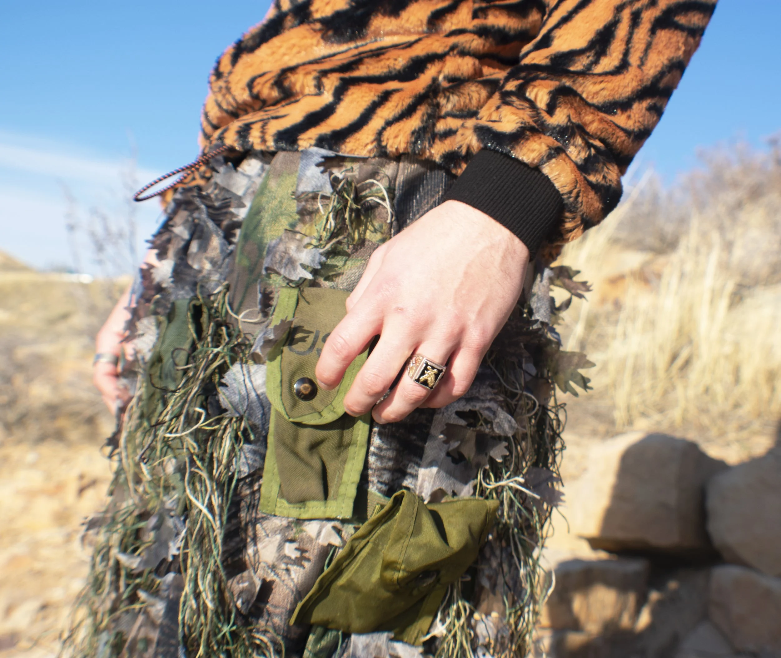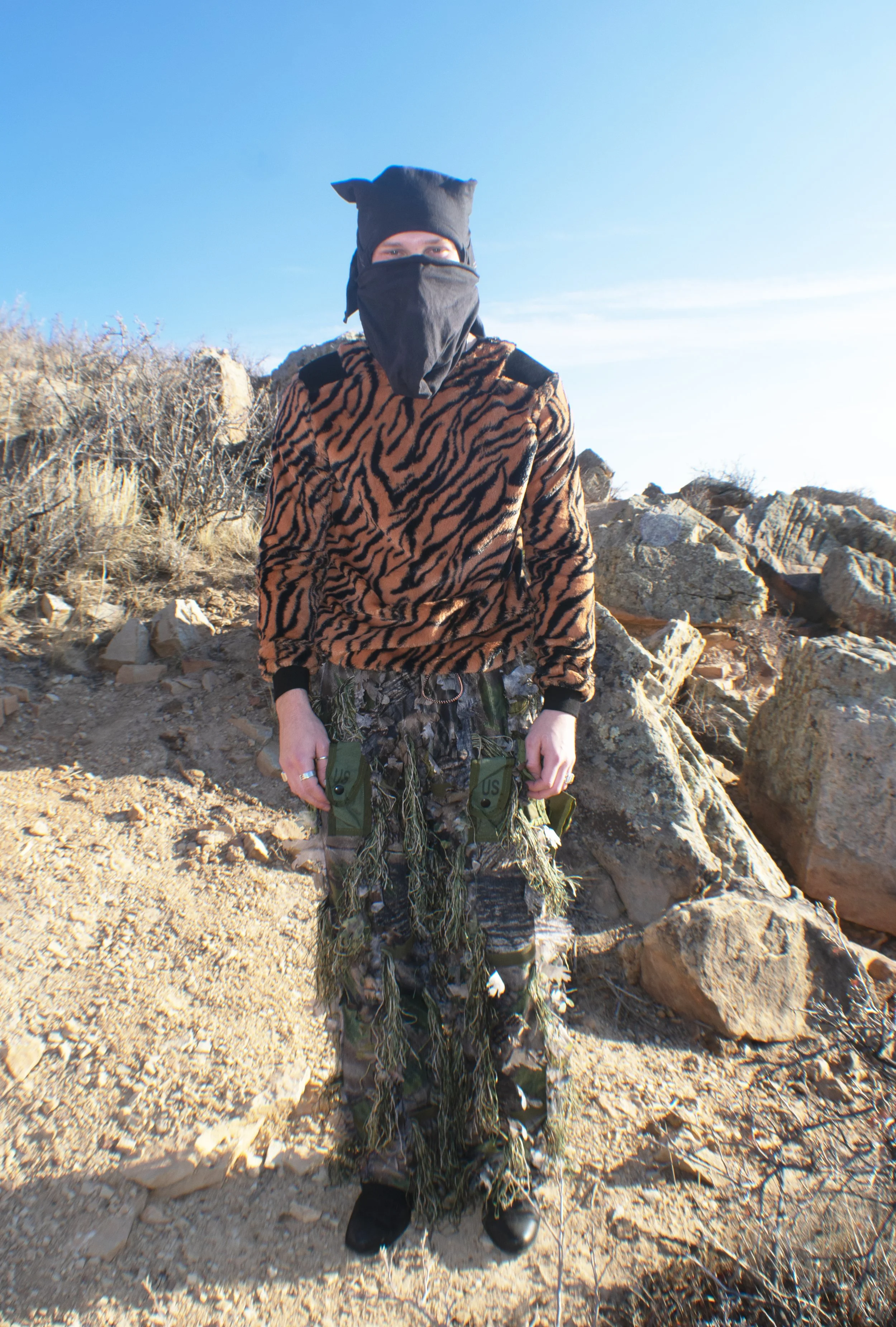 The second outfit features a faux fur tiger print tactical sweater, paired with fleece lined ghillie cargo pants with attachable pockets. The mask is constructed of a ski mask and tee shirt that was carefully draped and tacked in place in order to create a unique silhouette. Styled with black suede cowboy boots to accentuate the sharpness of the top of the look. My goal here was primarily to play with textures and introduce a silhouette that is unique to my collection.