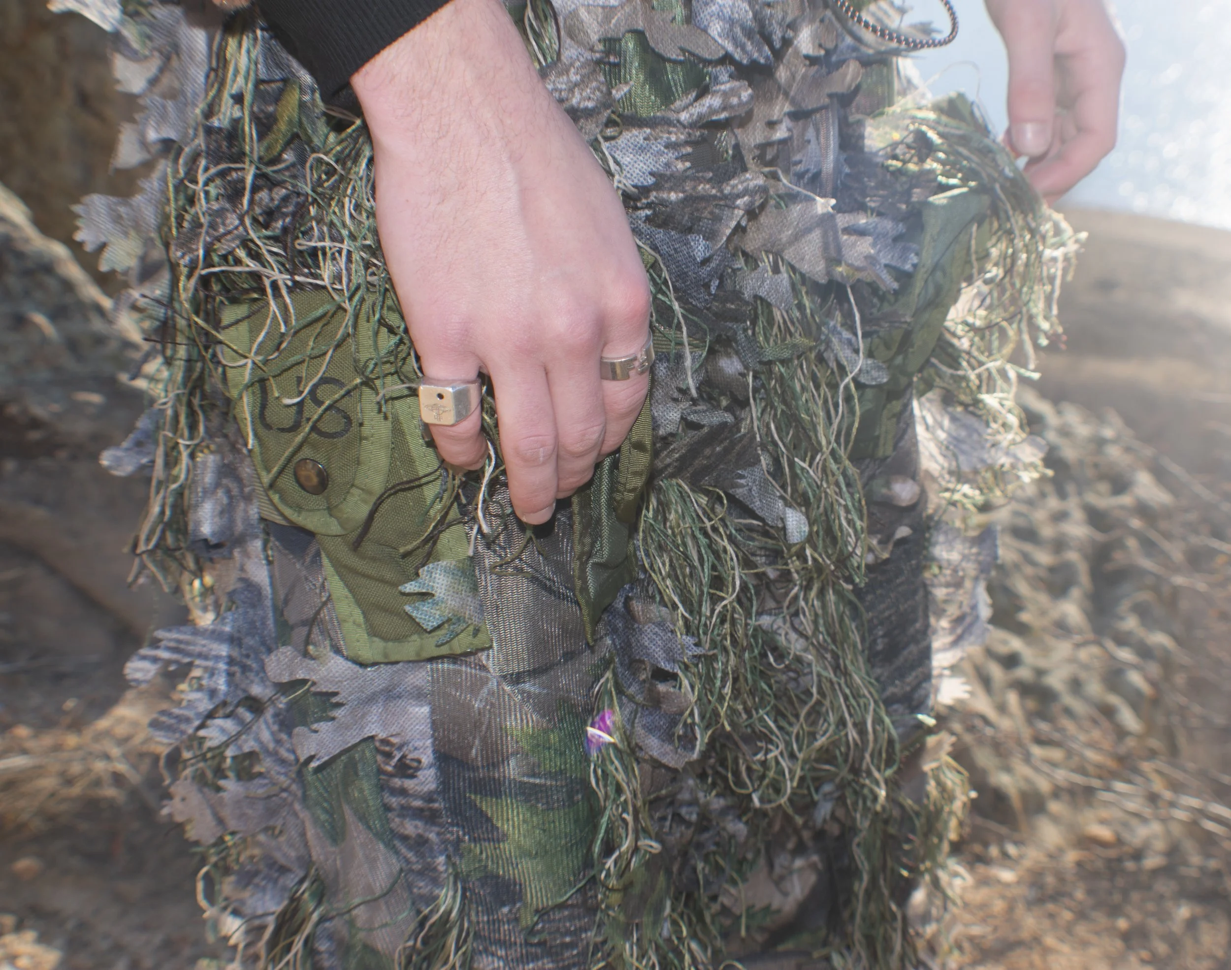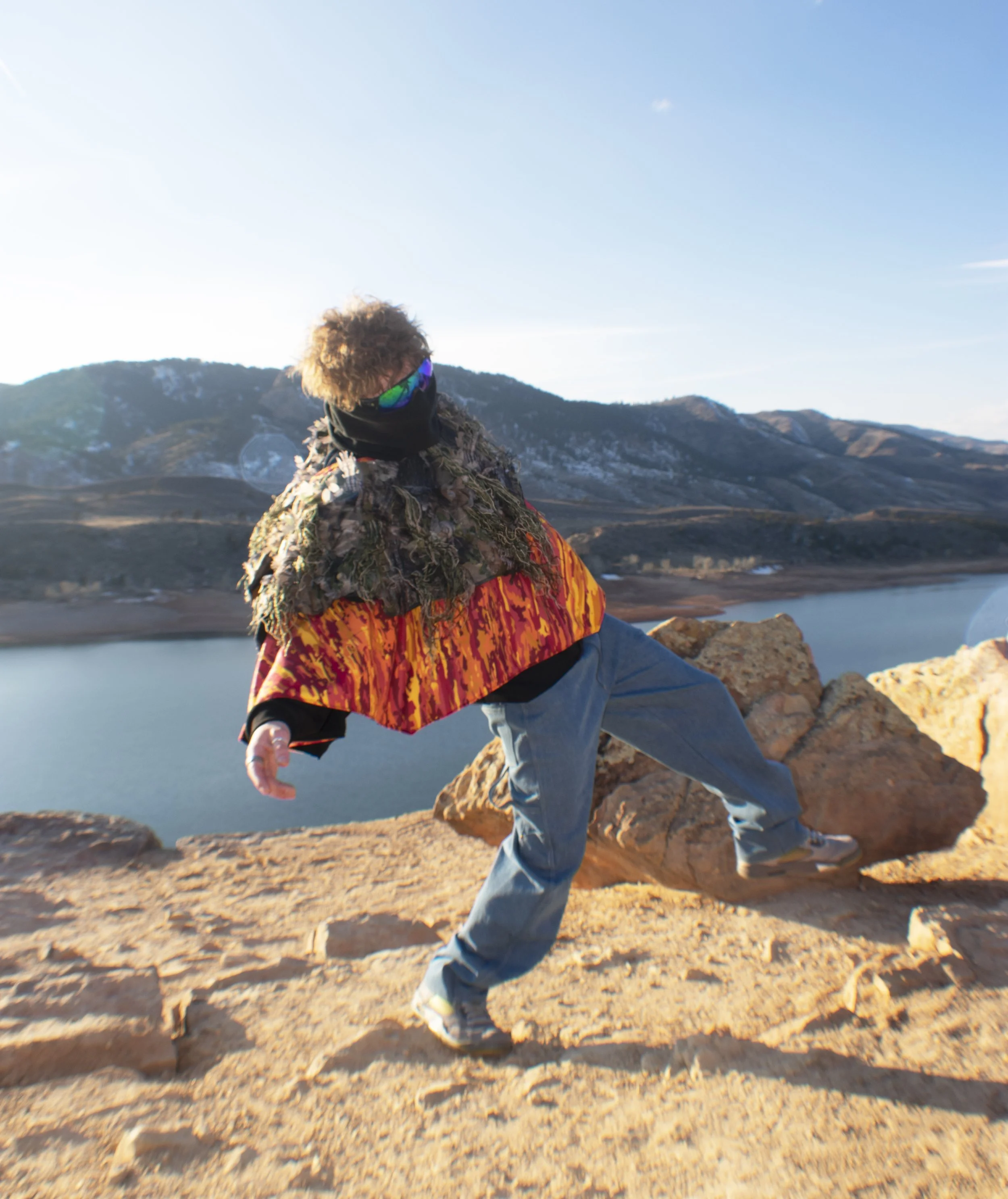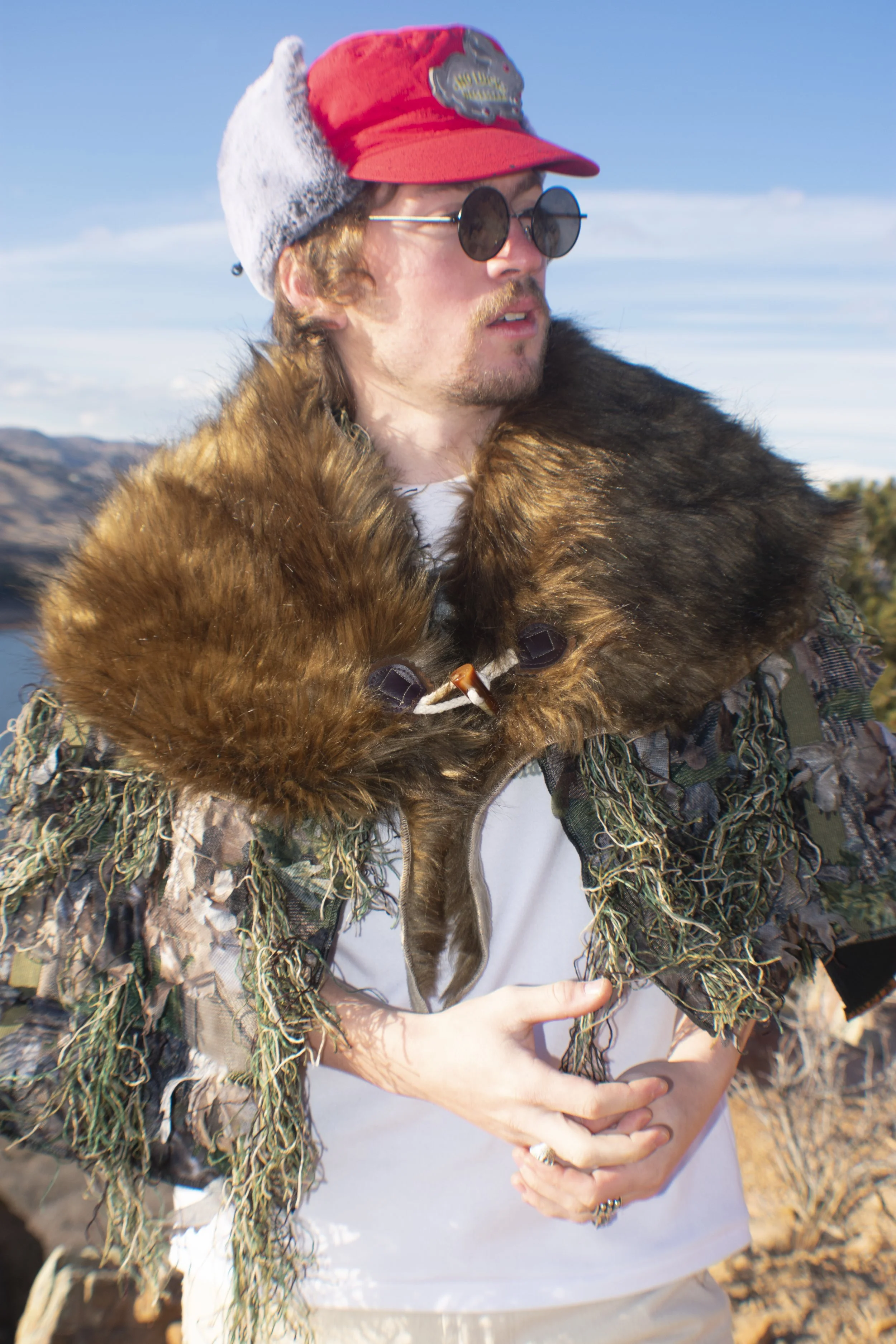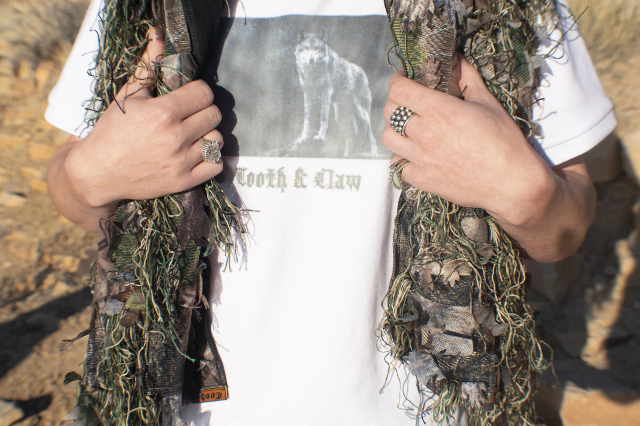 The fourth outfit features a fleece lined jersey knit long sleeve tee shirt that had been layered with a double faced fleece poncho that features my original camo and faux leather on garment branding on the inside. Atop the camo poncho is a fleece lined ghillie poncho to add more texture to the top of the silhouette. The bottoms are a pair of the same cut of carpenter jeans but in a lighter denim. Stylized with the look is a fleece gaiter and big cycling sunglasses to completely cover the models face for a mysterious aesthetic.