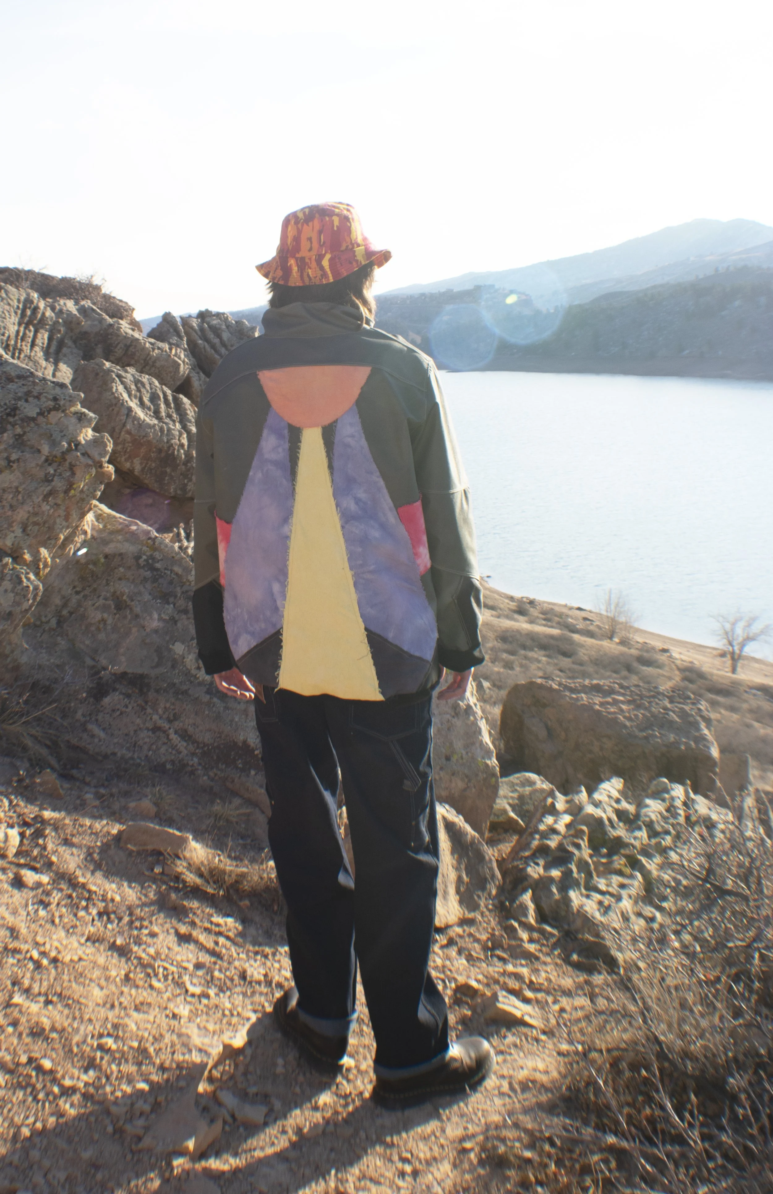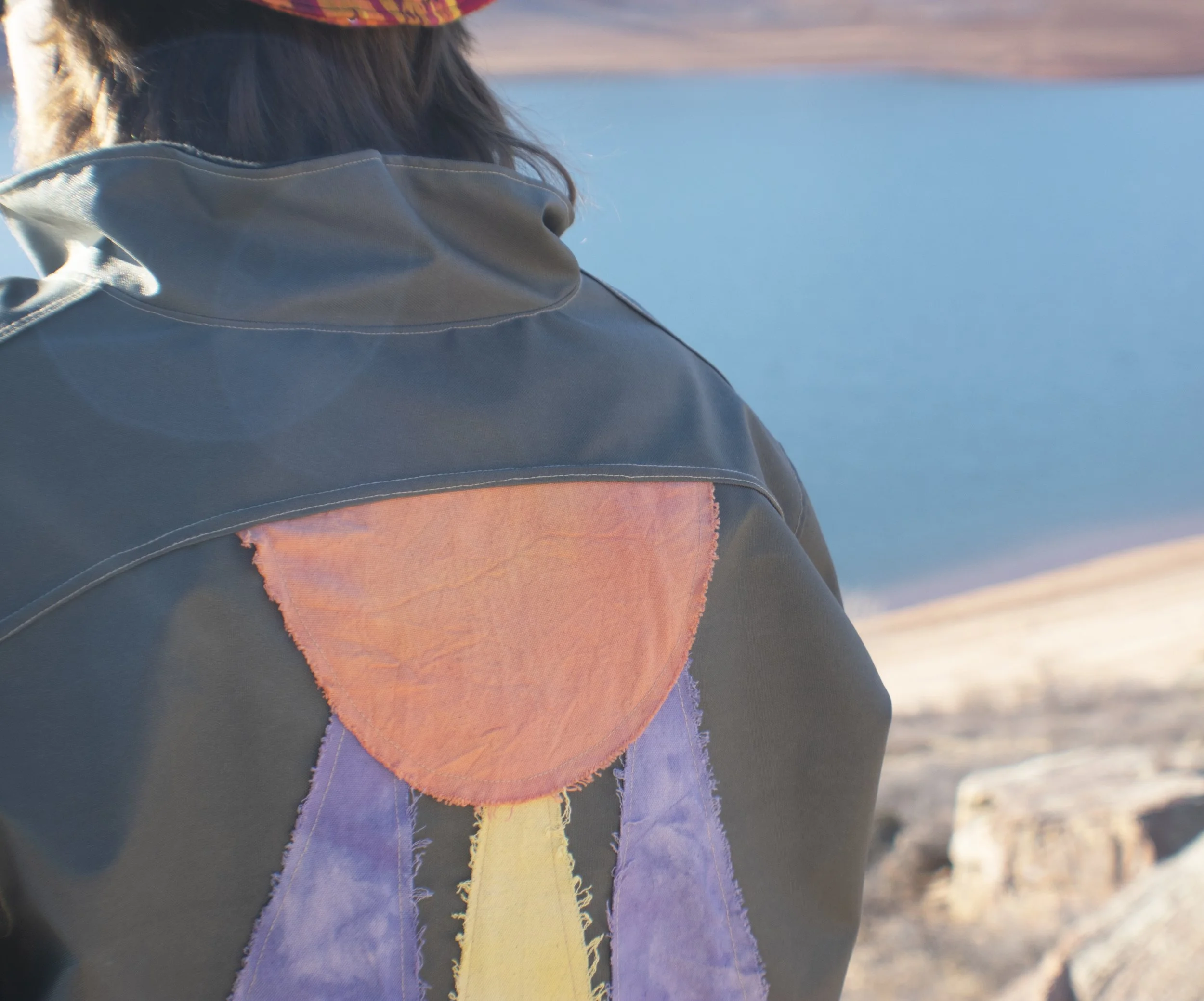 The third outfit features a jacket made from a waterproof duck canvas with hand dyed and cut patches appliquéd onto the shell of the jacket. It is also fleece lined and features quarter drop with a collar for ease to pull over and comfort. The jeans are hand crafted, featuring a branded faux leather patch on the back as well as carpenter pockets on the side seams. The bucket hat is a custom sublimated camo designed by me on a poly based fleece, featuring more leather branding and an adjustable drawstring. Styled with Doc Marten boots for any type of conditions.